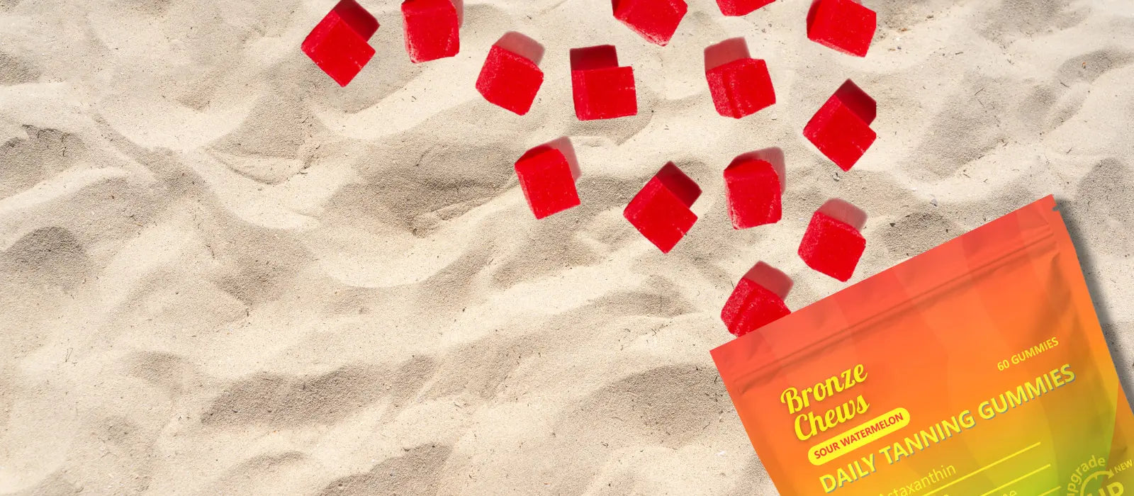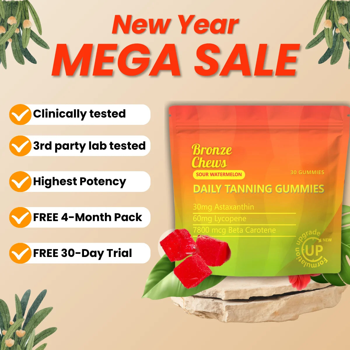 Our tanning gummies combine Beta-Carotene, Vitamin C, and Astaxanthin (from algae) to naturally enhance your tan. Beta-Carotene deepens your skin's pigmentation for a warm, bronzed glow, while Astaxanthin protects and evens out your tan. Vitamin C supports healthy, radiant skin, giving you a beautiful, sun-kissed look—without the harmful UV exposure.